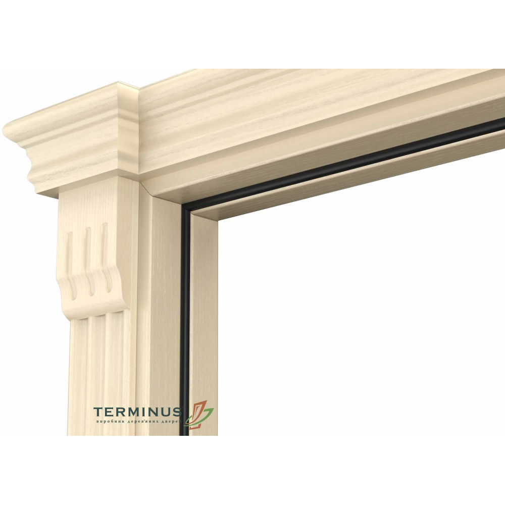 Лиштва: телескопічна, пласка шириною 74мм., канелюр шириною 84мм., або хвиля шириною 80мм., виготовляється із МДФ високої щільності, та облицьована високоякісним натуральним шпоном ясеня, з фінішним покриттям морилкою, та двухкомпонентним поліуретановим лаком. Телескопічна лиштва дозволяє зробити безцвяхове з'єднання до коробу.