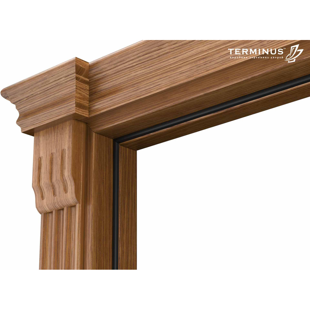 Лиштва: телескопічна, пласка шириною 74мм., канелюр шириною 84мм., або хвиля шириною 80мм., виготовляється із МДФ високої щільності, та облицьована високоякісним натуральним шпоном дуба, з фінішним покриттям морилкою, та двухкомпонентним поліуретановим лаком. Телескопічна лиштва дозволяє зробити безцвяхове з'єднання до коробу.